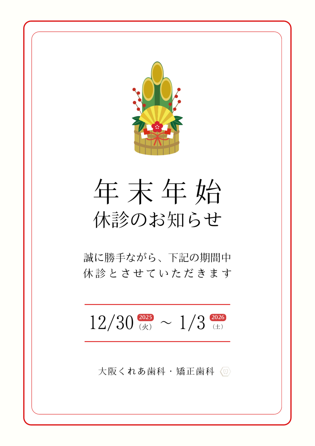 今年も残りわずかとなりました🧤🧣 平素より大阪くれあ歯科・矯正歯科をご利用いただき、誠にありがとうございます🦷 年末はお仕事やご家庭の行事で忙しくなり、お口のケアが後回しになりがちです。しかし、虫歯や歯周病は「違和感が出てから」では年明けまで我慢することになるケースも少なくありません。 年内にチェック✓しておき …