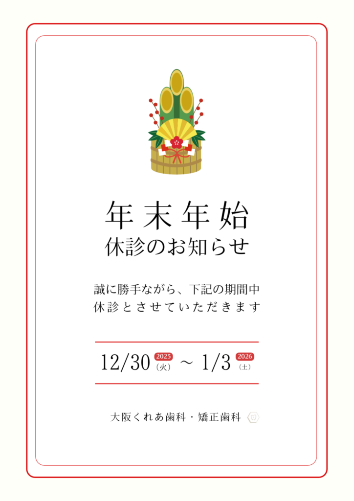 本年も大変お世話になりました。皆さまのご健康とご多幸をお祈り申し上げますとともに、良い新年をお迎えください。来年も大阪くれあ歯科・矯正歯科をどうぞよろしくお願いいたします🐎