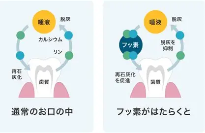 フッ素は溶けかけた歯を修復する「再石灰化」を促進し、虫歯の進行を防ぐ働きがあります。