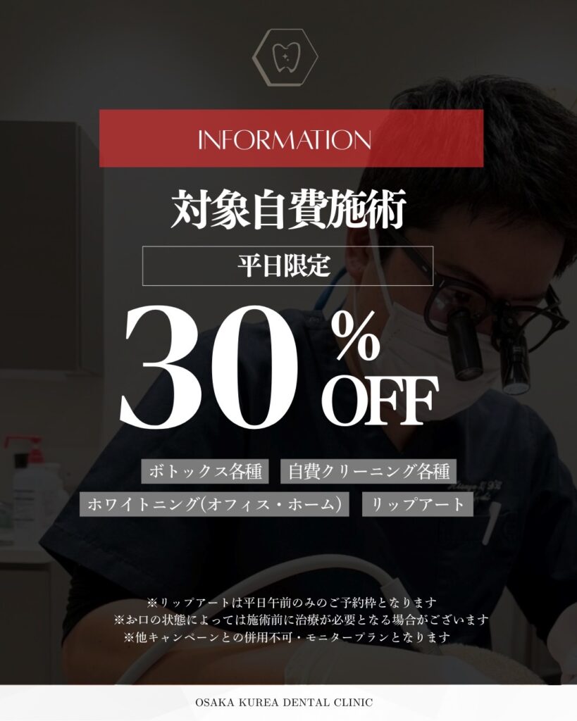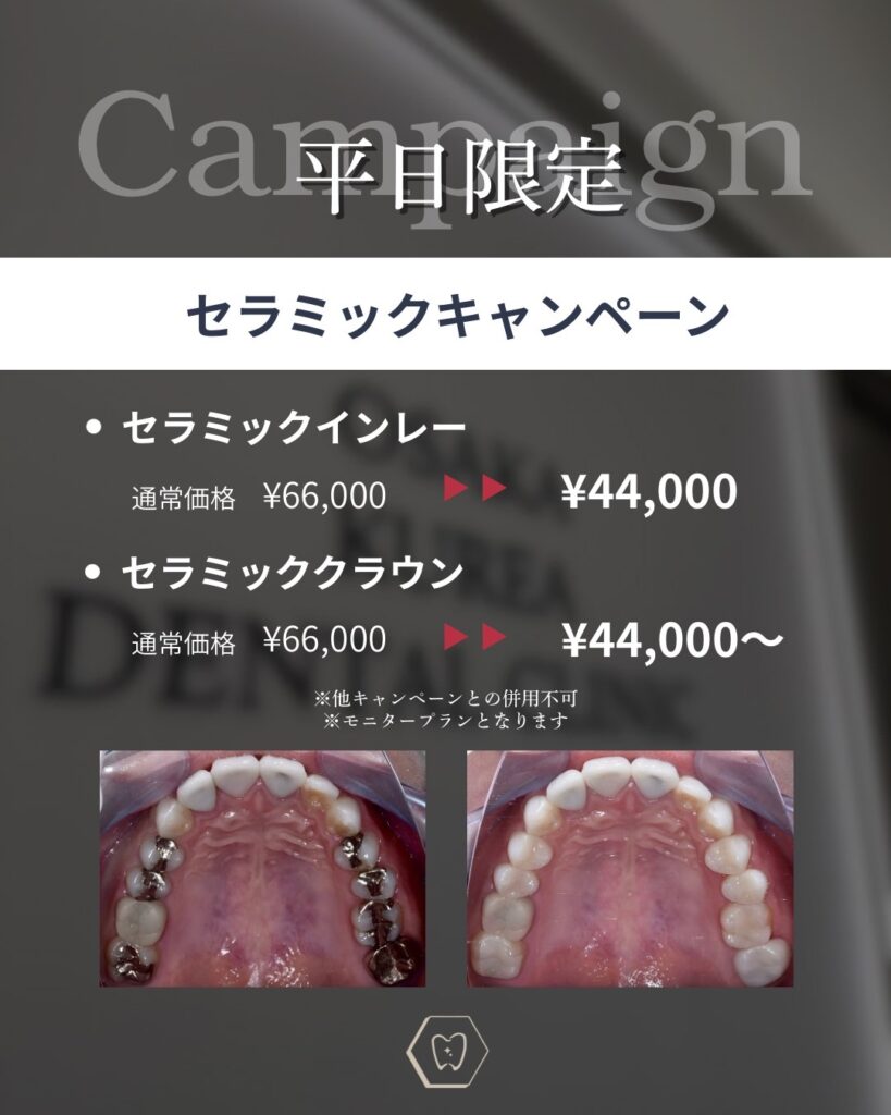 〒544-0004 大阪府大阪市生野区巽北3丁目14−17 1F 9:30-13:00 14:30-18:30 ◎土日 9:30~17:00 お昼休憩なしの診療となります 歯科コラム 2026/01/15 大変お得! 平日限定割引、最大22000円🎵 この物価高の世の中だからこそ、値下げさせていただきます! 大変お得となっております、この機会に是非施術お受けになってみてはいかがでしょうか? 歯科コラム 2026/01/14 銀歯をセラミックに♪ 今なら平日22000円割引! チラッと見える銀歯、笑うと目立つ銀歯気になりませんか? 今ですと通常価格より22000円offでセラミックに変えれます! 是非この機会にご相談下さい♪