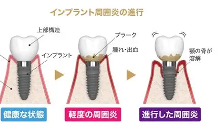 「インプラント周囲炎」という歯周病に似た炎症は起こります。