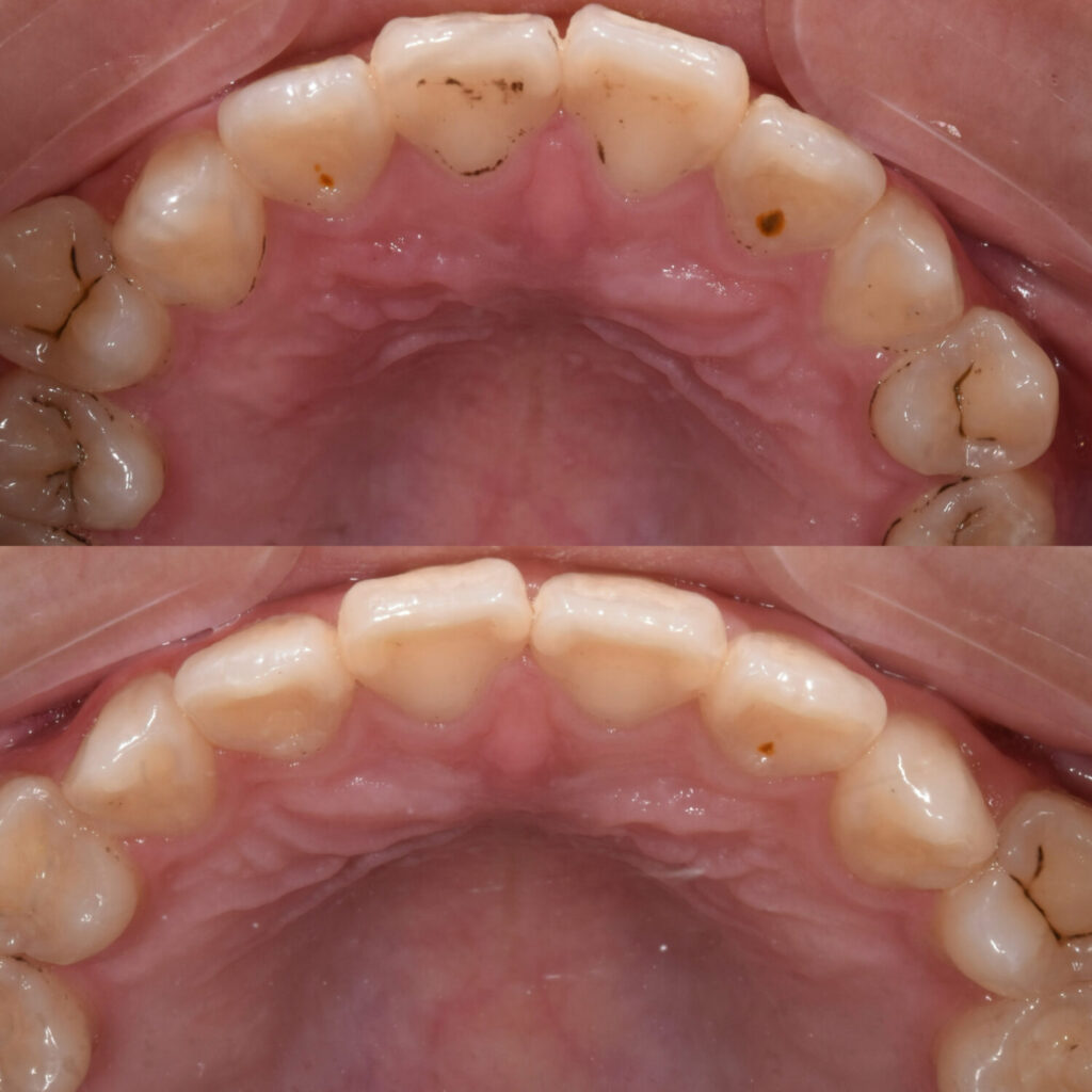 歯の裏側に着色汚れ、歯石がついている状態です。忙しいため1回で汚れを取りたいとのご要望だったため、自費クリーニングを提案させていただきました。