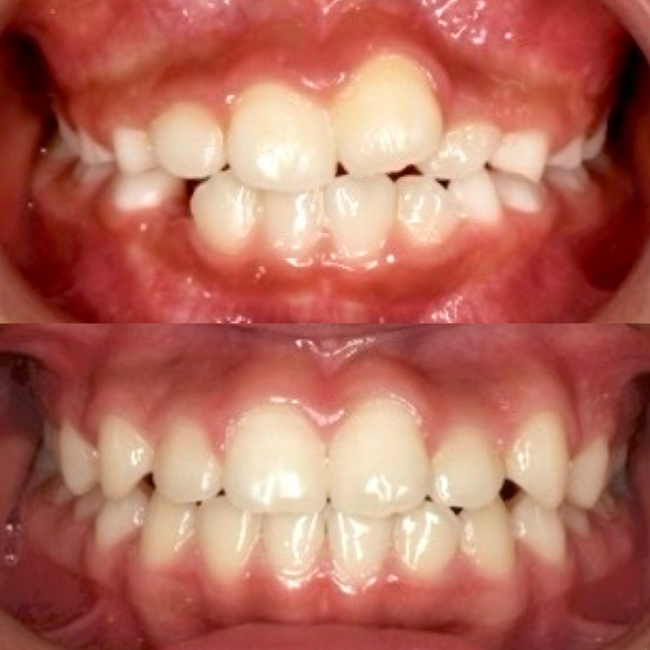 前歯のガタつきをお父さんお母さんが気にされ来院されました。 小学3年生及び、まだ乳歯(子供の歯)がたくさん残っております。成長についても発育段階の為、小児矯正治療の適応となり、精密検査を実施、治療を開始しました。 治療前 治療後 比較写真 小児矯正治療は、生え変わりの進行具合、年齢により治療可否が分かれます。早めにご相談にお越し下さい。 具体的には小学 …